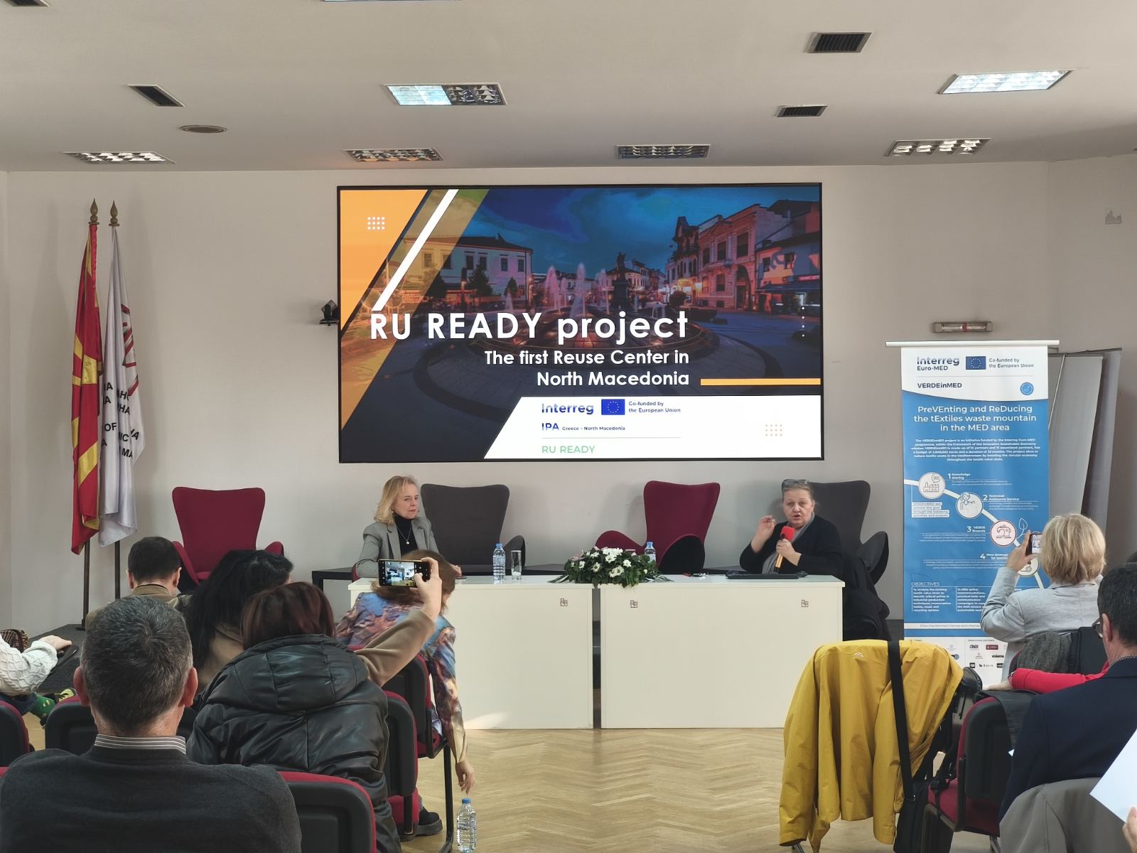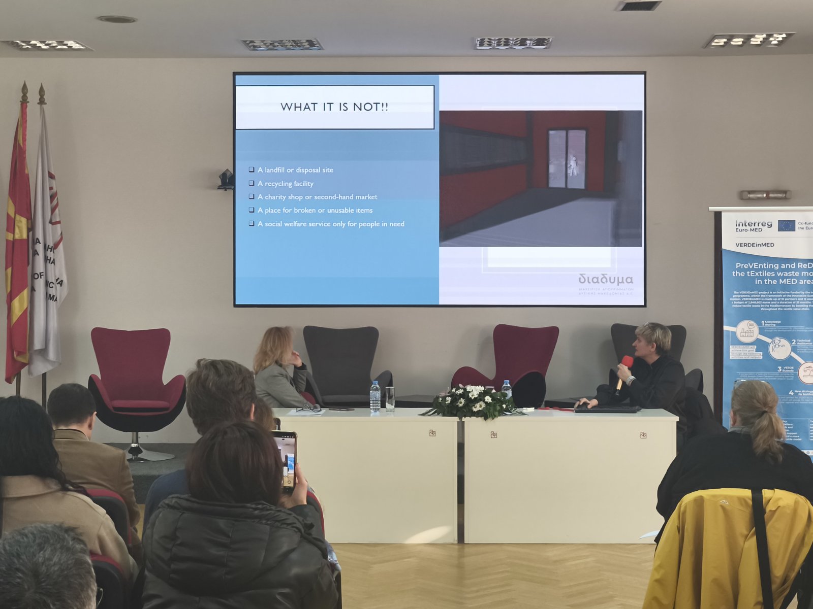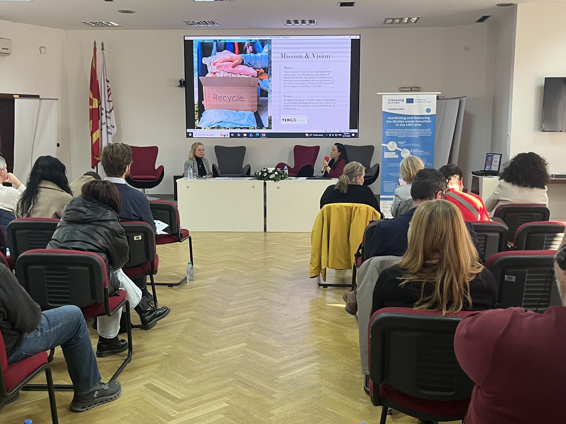 Presentation were delivered by Marijana Perkovska, President of the Textile Trade Association – Textile Cluster; Ana Karanfilova Mazneva, Head of the Waste Management Department at the Ministry of Environment and Physical Planning; Evgenija Najdoska, Manager of the Producer Responsibility Organisation at TEKSOMAK; and Irina Tosheva, fashion designer, who addressed circular practices and the social impact of upcycled fashion. The event was moderated by Natasha Sivevska, Executive Director of the Textile Trade Association – Textile Cluster and Project Manager of the VERDEinMED project.